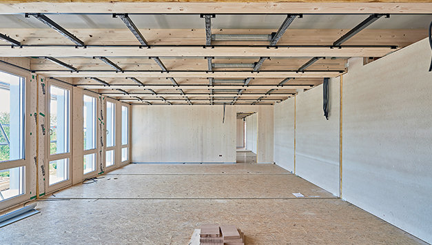 Die Kombination von Holz, Beton und der ecoboost2 Deckenklimatisierung mit aktiver Speichermasse sorgt für ein perfektioniertes Raumklima und ermöglicht es, bis zu 30 Prozent Energie einzusparen. Lüftung, Kühlung, Heizung, Akustik, Leuchten und Sprinkler – alles steckt vorgefertigt in den SupraFloor ecoboost2 Decken.