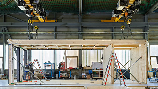 Das Gebäude mit einer BGF von 8‘200m2 besteht aus 210 Modulen und bietet Platz für rund 60 Klassenzimmer. Mit diesem Projekt wird das patentierte Holz-Hybrid-Bausystem erstmals in Deutschland angewendet. Das einzigartige System vereint das geringe Gewicht und die hohe Zugfestigkeit von Holz mit der Druckfestigkeit und Masse von Beton zu einem optimierten Tragelement.