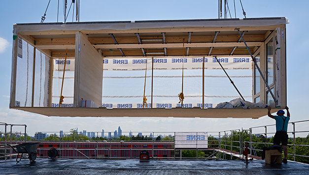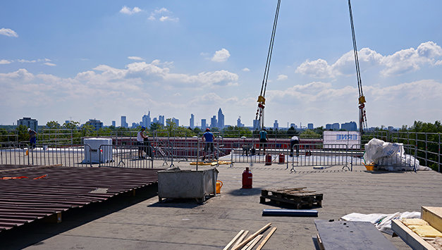 Bis zu 20 Tonnen schwer und 18 Meter lang sind die Holzmodule, aus denen das Hauptgebäude des Gymnasiums Nord entsteht. In diesen Tagen wird das erste Obergeschoss zusammengesetzt. Das vor anderthalb Jahren am Friedhof Westhausen eröffnete Gymnasium hat schon jetzt 350 Schüler, nach den Sommerferien soll der nächste Fünfer-Jahrgang mit bis zu acht Klassen hinzukommen. Die neuen Schüler sollen in dem schon bestehenden Gebäude unterkommen, das vor zwei Jahren ebenfalls aus Holzmodulen errichtet wurde. Dort sollen künftig auch der Musikunterricht und das Nachmittagsprogramm stattfinden. Die beiden älteren Jahrgänge und die Schulverwaltung werden hingegen in das neue Hauptgebäude umziehen, wo auch die naturwissenschaftlichen Fachräume eingerichtet werden. Gestern verschafften sich Baudezernent Jan Schneider (CDU) und Bildungsdezernentin Sylvia Weber (SPD) einen Eindruck vom Fortschritt der Bauarbeiten.