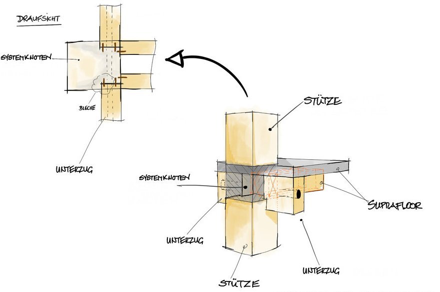 • Materiallogik mit klarer Rollenverteilung: Holz übernimmt Zug, Beton Druck – ergänzt durch schlanken Stahleinsatz gegen schwinden im Beton.