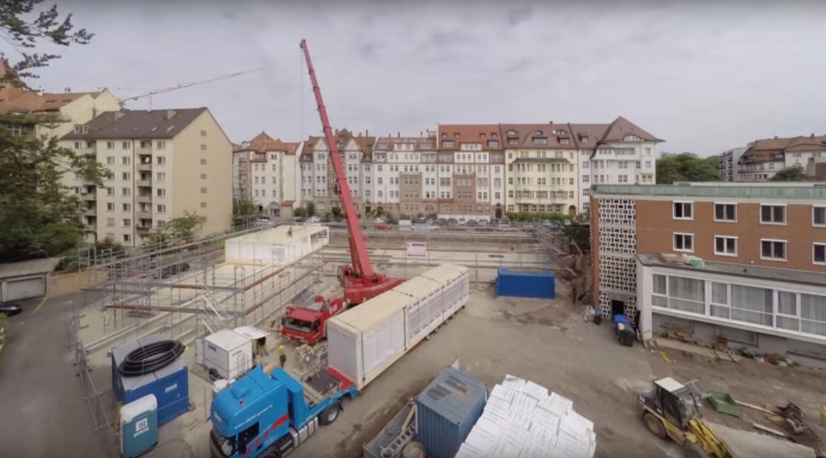 Um während der Baumassnahmen für den Neubau der Maria-Ward-Schule in Nürnberg (DE) den Betrieb sicherstellen zu können wurde auf demselben Grundstück ein Schulgebäude aus 85 Holz-Modulen und eine Sporthalle errichtet. Dabei wurden 17.50 Meter lange OSB-Platten, die längsten OSB-Platten der Welt, verbaut. Sehen Sie hier den Aufbau im Zeitraffer.