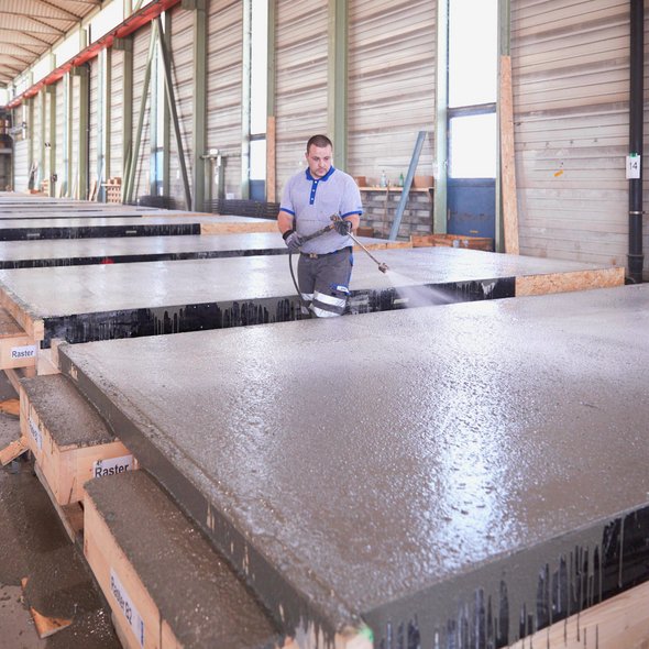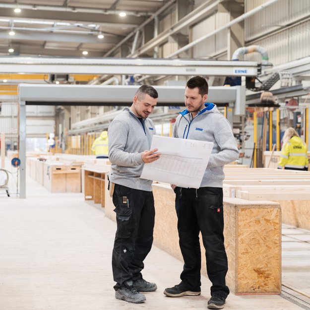 In der hauseigenen Produktion werden die geplanten Elemente für das vorgesehene Gebäude aus einzelnen Baumaterialien gefertigt. Hierfür sind verschiedene Produktionslinien in den Werkhallen eingerichtet. Bei Aussenwand-Elementen werden jeweils die Fenster am Ende der Produktionsstrasse eingebaut.