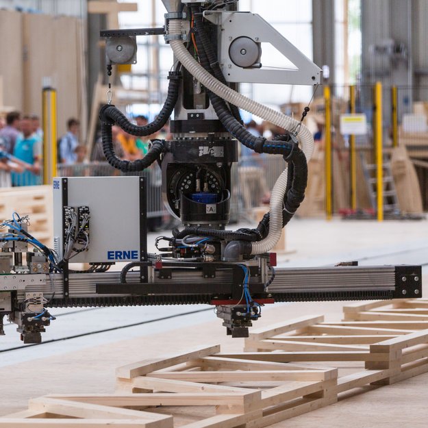 Unsere industrielle Vorfertigung im eigenen Werk umfasst die Produktion von Boden-, Wand- und Deckenelementen sowie den Einbau von Fenstern, Türen und Gebäudetechnik. So entsteht ein vollendeter Gebäudeteil im Werk, das sich durch eine besonders zügige Montage auf der Baustelle auszeichnet.