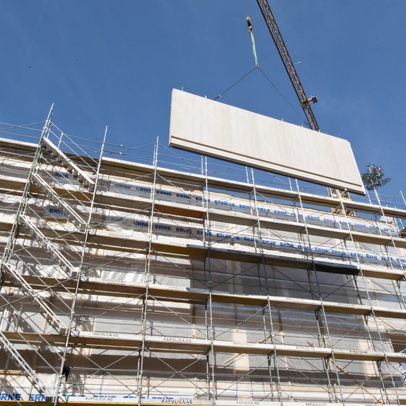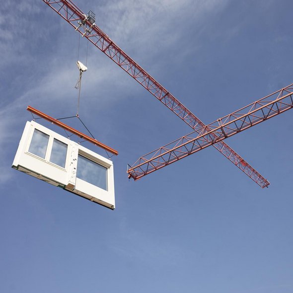 Auf der Baustelle werden die im Werk gefertigten Elemente nach einem einfachen Bauprinzip montiert. In kurzer Zeit entsteht so der fertige Rohbau. Da die Fenster bereits in der Gebäudehülle vorintegriert sind, besteht der grosse Vorteil, dass bei Witterung keine Feuchtigkeit mehr in das Gebäude eindringen kann.