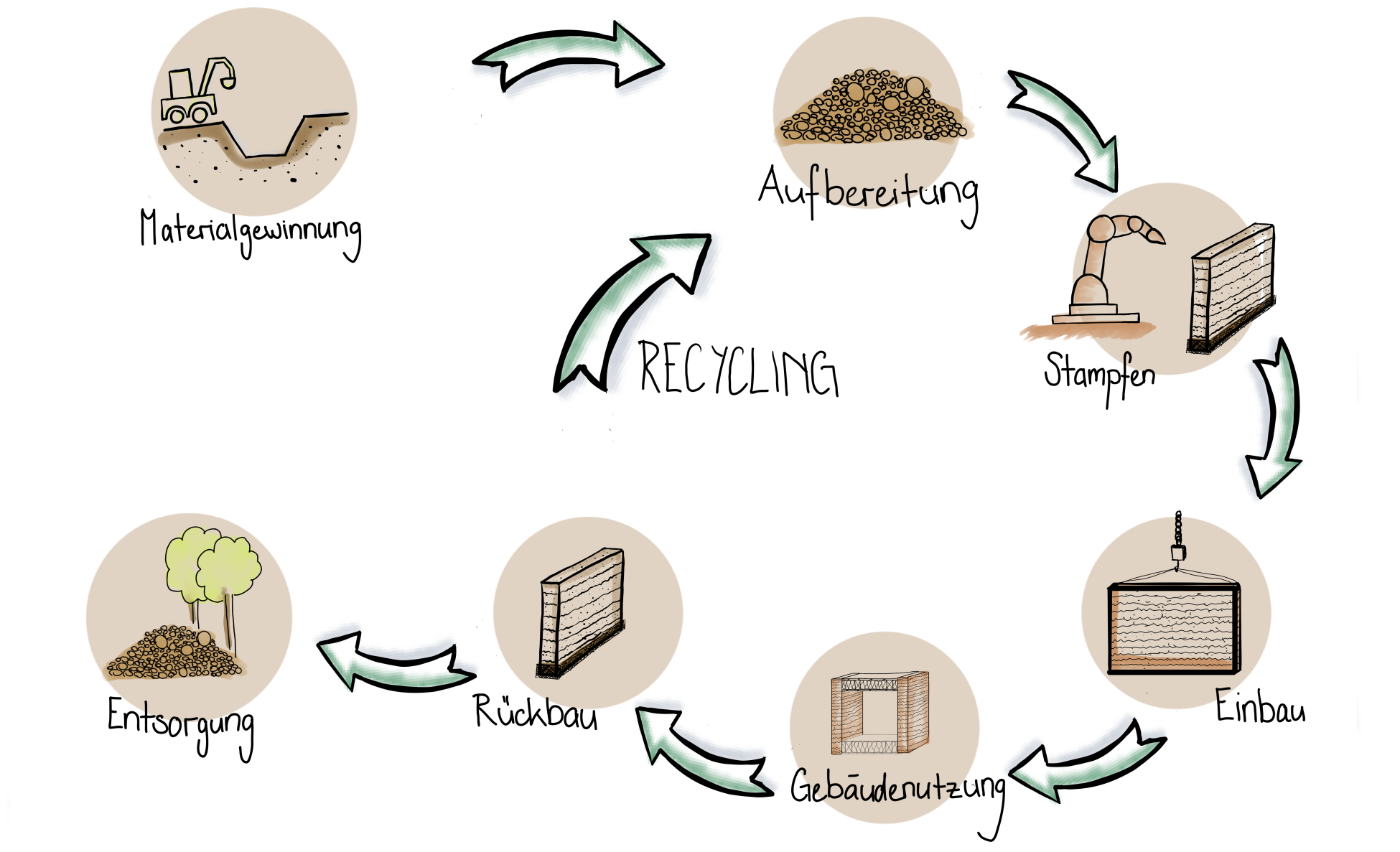 Durch die Verwendung von natürlichen und kreislauffähigen Baustoffen wie dem Lehm kann nicht nur der CO2-Fussabdruck reduziert werden, es entstehen auch geschlossene Materialkreisläufe anstelle der linearen Materialnutzung. Der Aushub aus der Baugrube wird zum Bauen verwendet, anstatt dass er als Abfall deponiert werden muss. Die aus Lehm erstellten Wände sind deshalb nicht nur nachhaltig, sie sorgen mit ihrer Masse und Atmungsaktivität auch für ein optimales Raumklima.