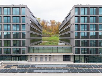 Fassade aus Holzelementen, in Teilen Pfosten-Riegel-Fassade