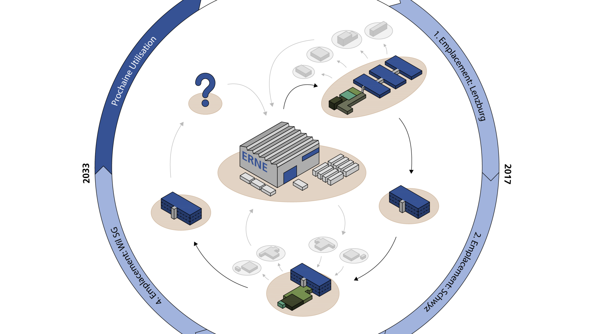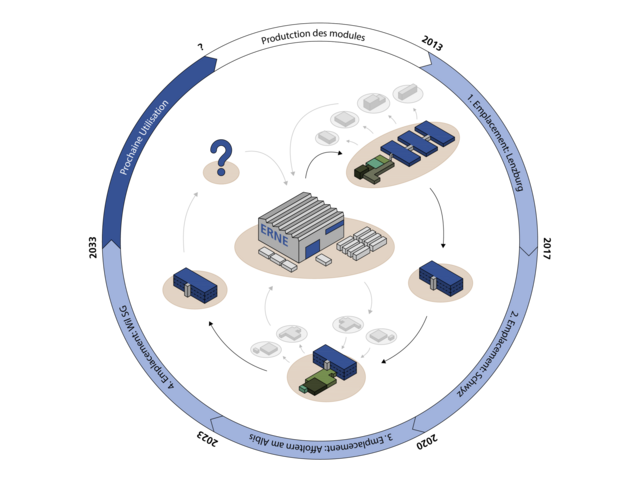 Les bâtiments modulaires ERNE sont conçus dès le début de la planification pour une utilisation multiple et peuvent être adaptés individuellement aux besoins du nouveau site grâce à une trame modulaire flexible. La planification et la mise en œuvre dans la grille permettent, outre la dislocation simple de l'ensemble de l'installation, un recyclage ou un upcycling facile des différents éléments de construction.