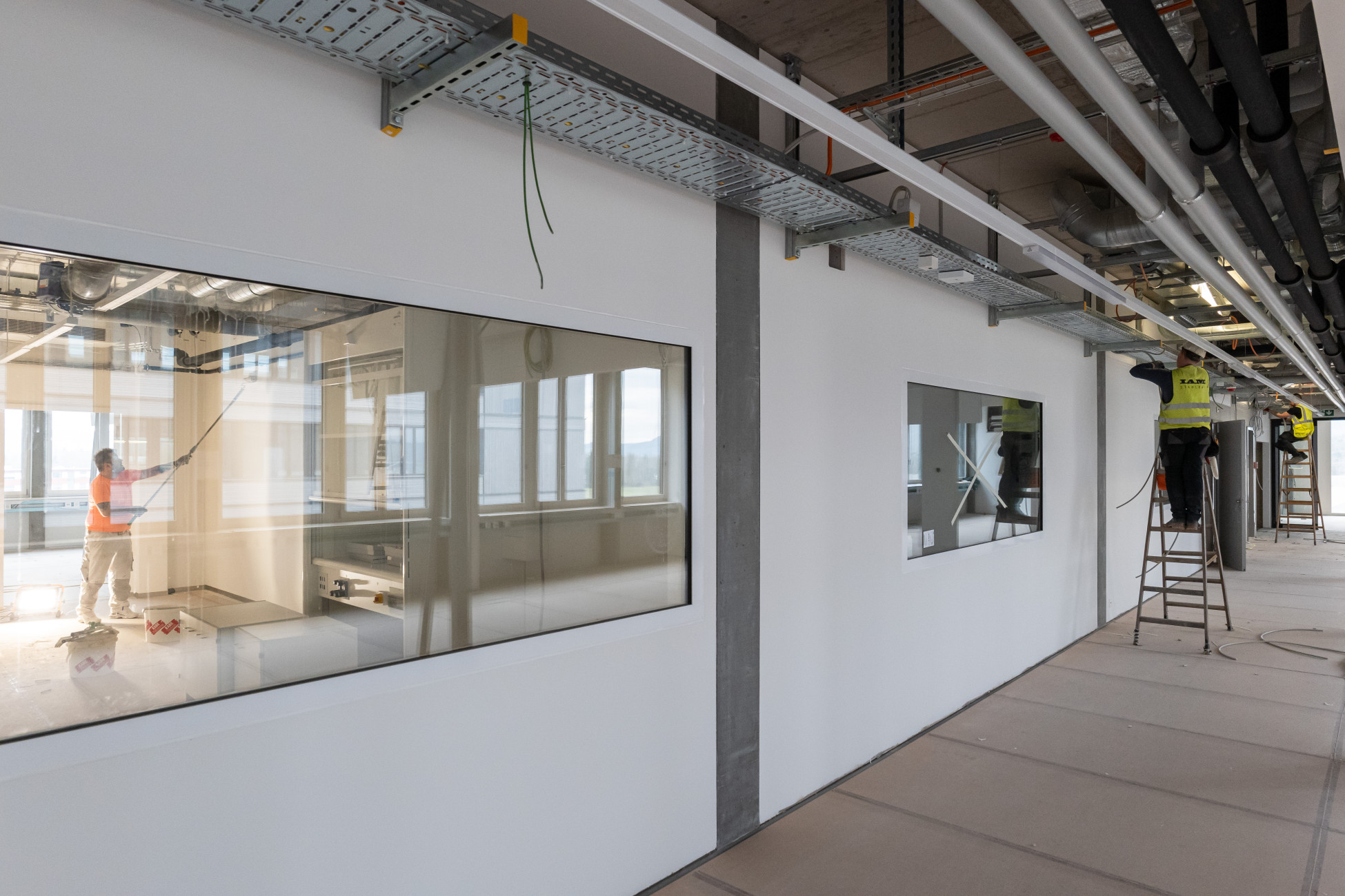 Depuis le printemps 2020, l'équipe d'ERNE SA Holzbau, dirigée par Daniel Leber, est en train de couler les fondations du nouveau bâtiment et d'élever les premiers murs. Ainsi, le hall des salles blanches, les fondations des ateliers de haute précision et une partie du parking souterrain ont déjà pu être construits. On est maintenant en train d'ériger les sous-sols et les rez-de-chaussée des deux bâtiments principaux de six étages.