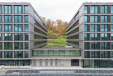 Le complexe de recherche et de développement porte déjà cette devise sur sa façade. Constitué en majorité de boisneutre en CO2, des panneaux solaires placés entre les différentes fenêtres génèrent de l'électricité de manière durable. La structure flexible des locaux offre une multitude de salles de recherche, d'ateliers et de laboratoires.