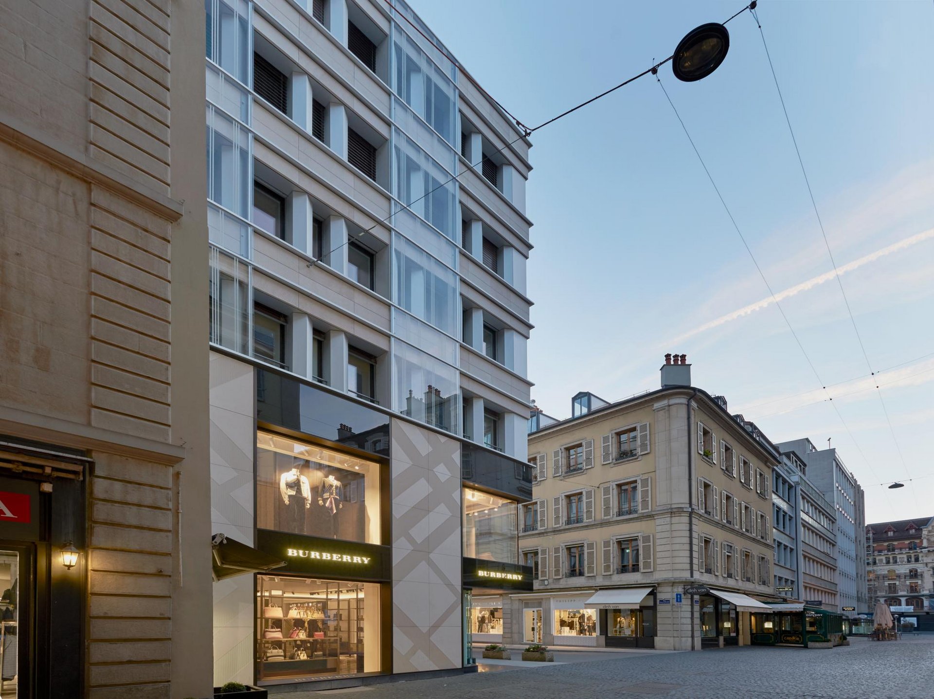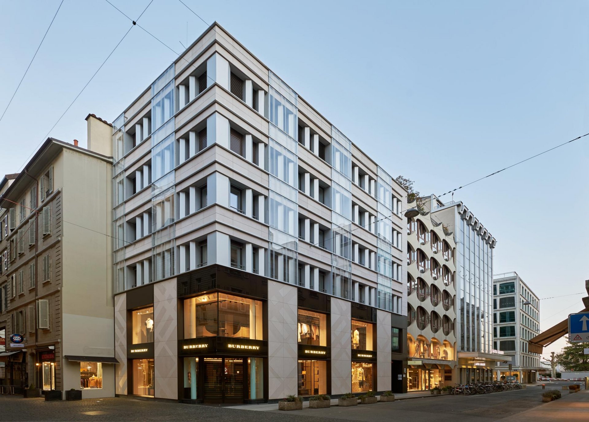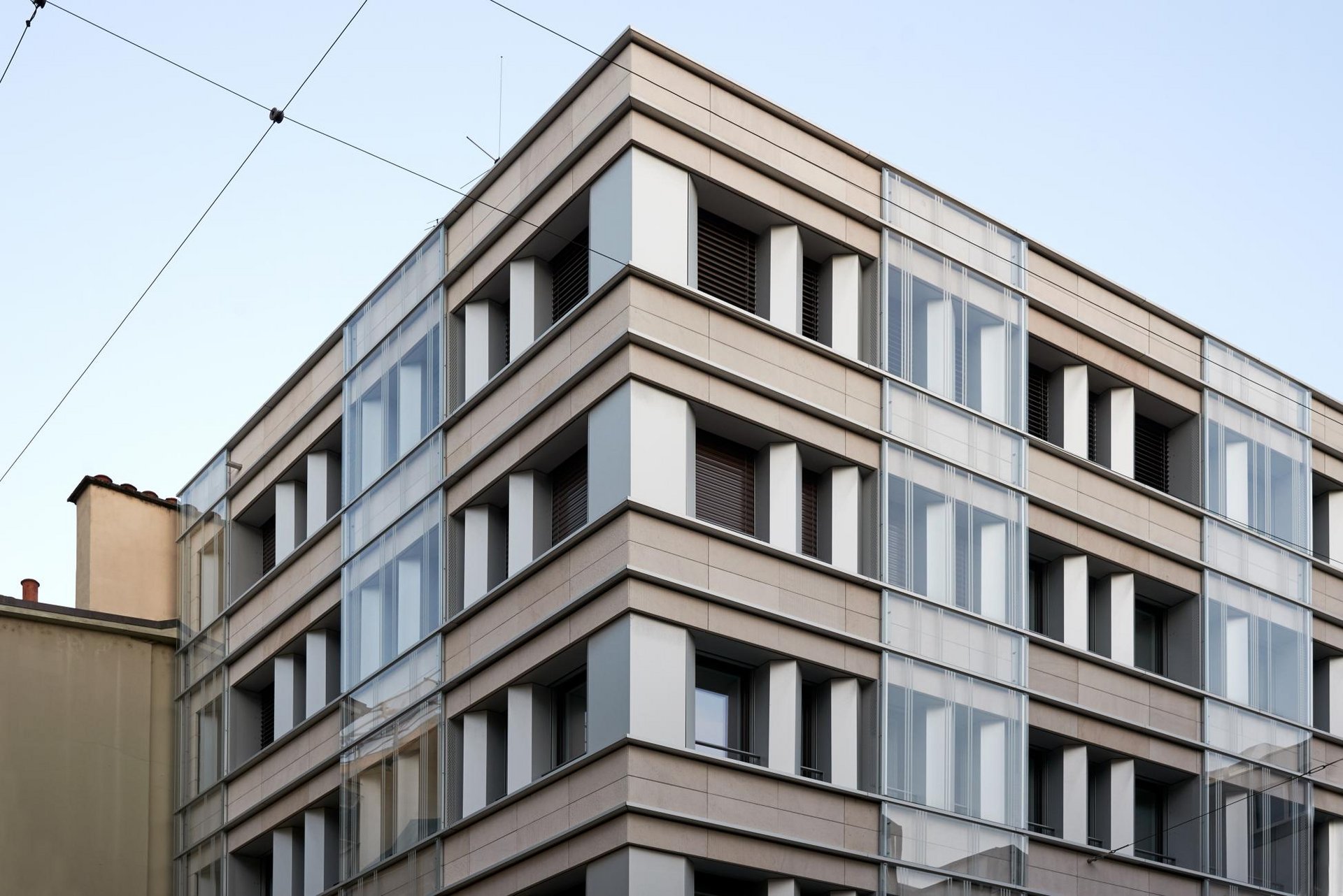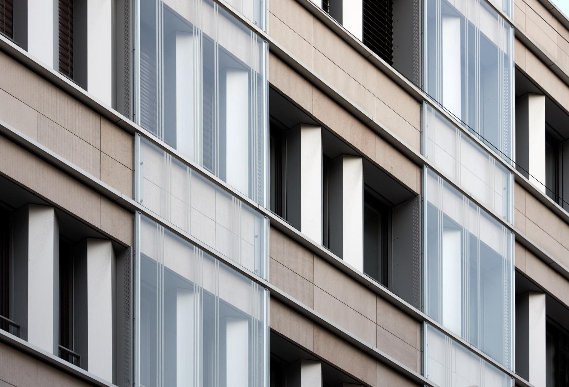 Façade ventilée avec bardage en pierre, tôle et verres de sécurité trempés